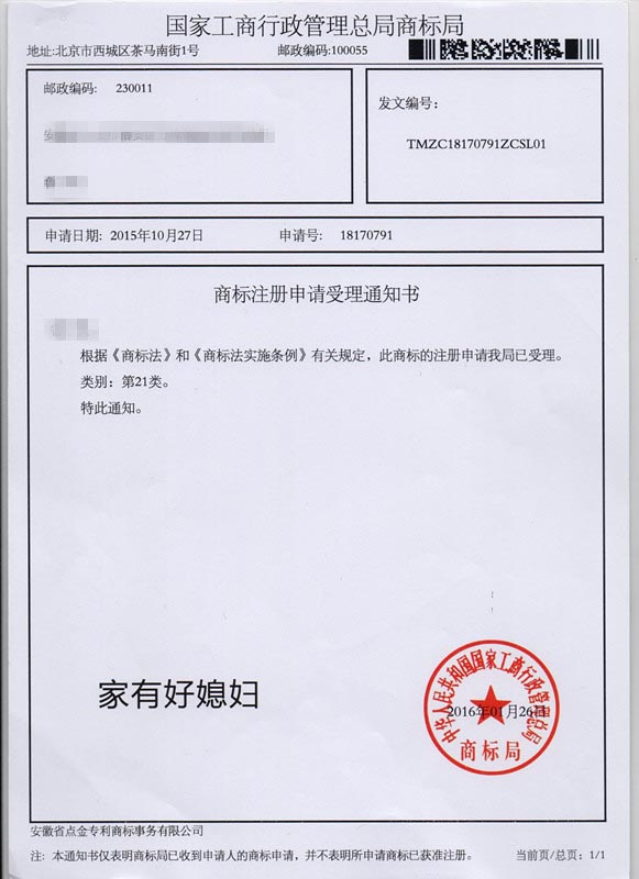 第21类“家有好媳妇”商标受理通知书