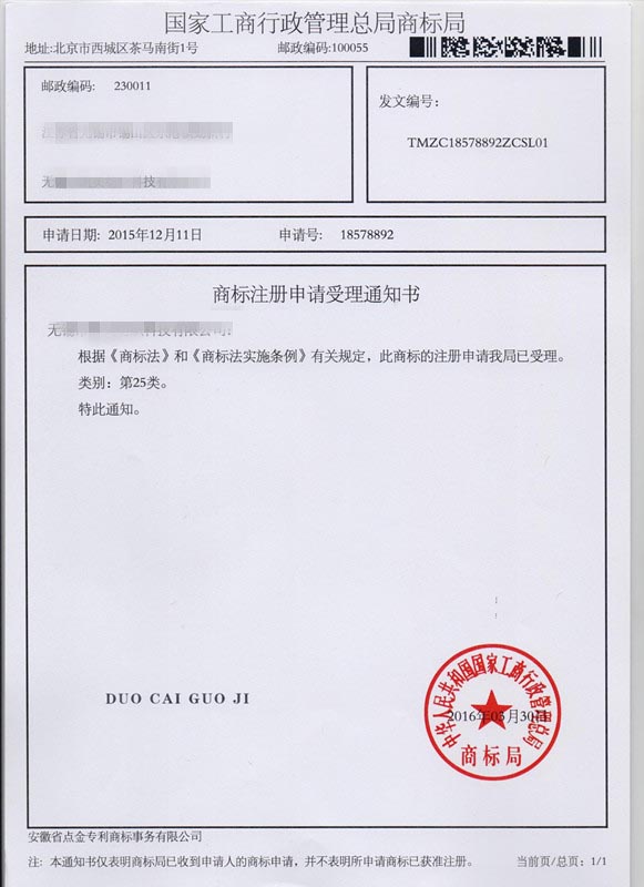 第25类“DUO CAI GUO JI”商标受理通知书
