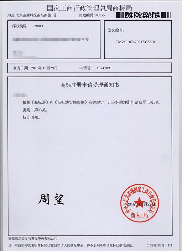 第43类“周望”商标受理通知书