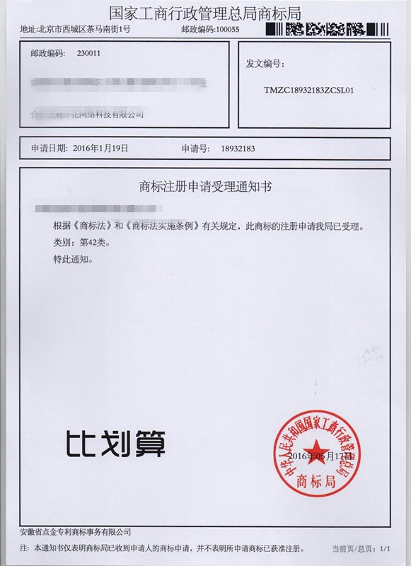 第42类“比划算”商标受理通知书