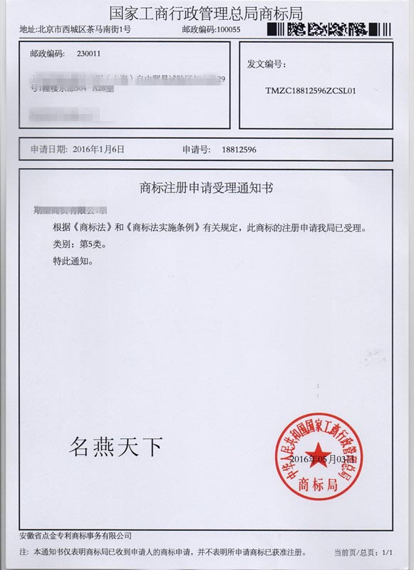 第5类“名燕天下”商标受理通知书