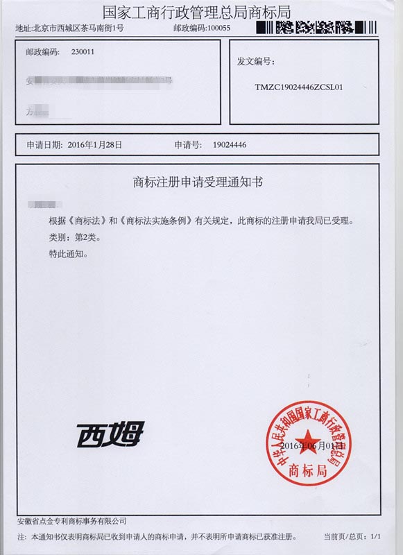 第2类“西姆”商标受理通知书