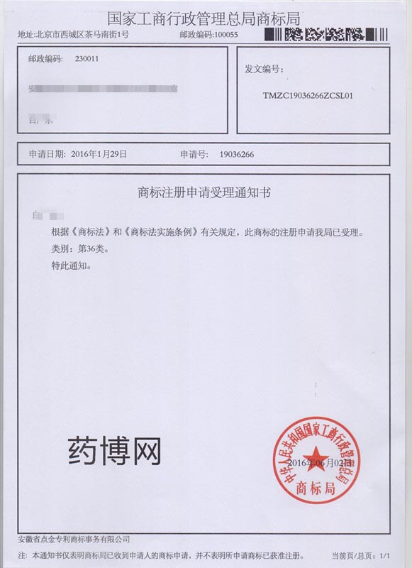 第36类“药博网”商标受理通知书