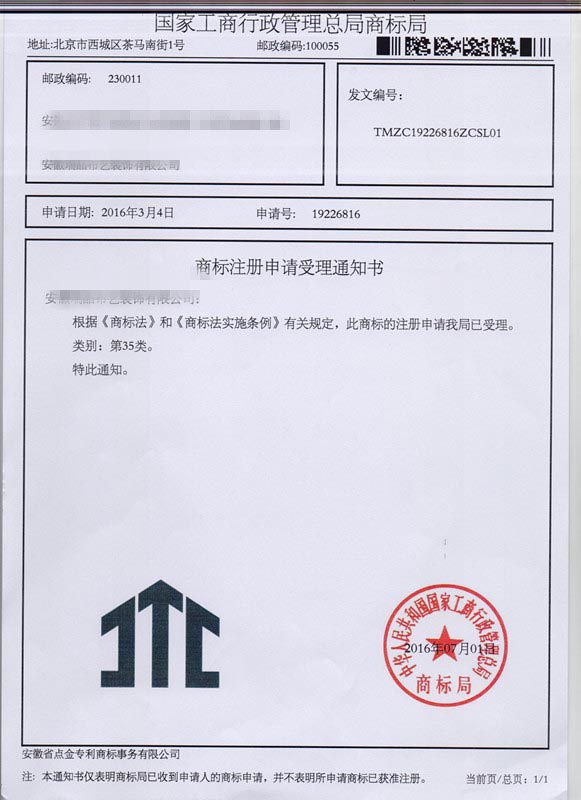 第35类图形商标受理通知书