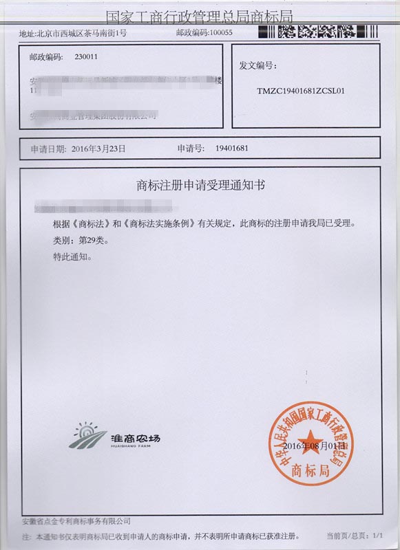 第29类“淮商农场”商标受理通知书