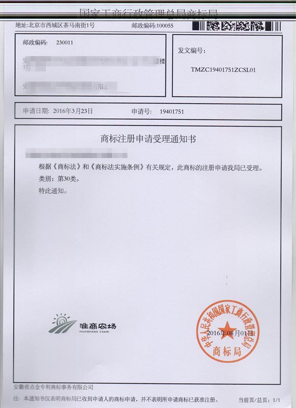 第30类“淮商农场”商标受理通知书