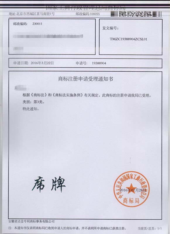 第3类“席牌”商标受理通知书