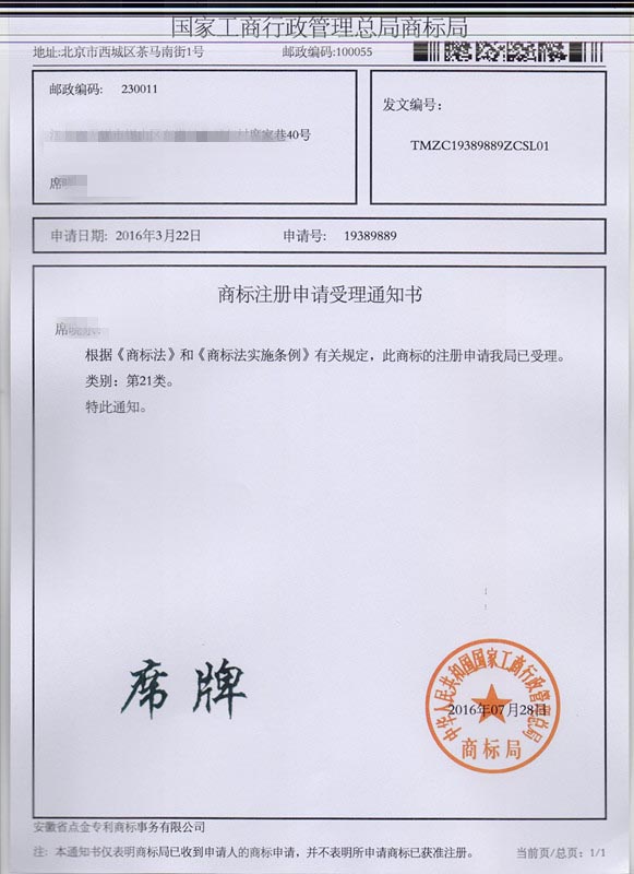 第21类“席牌”商标受理通知书