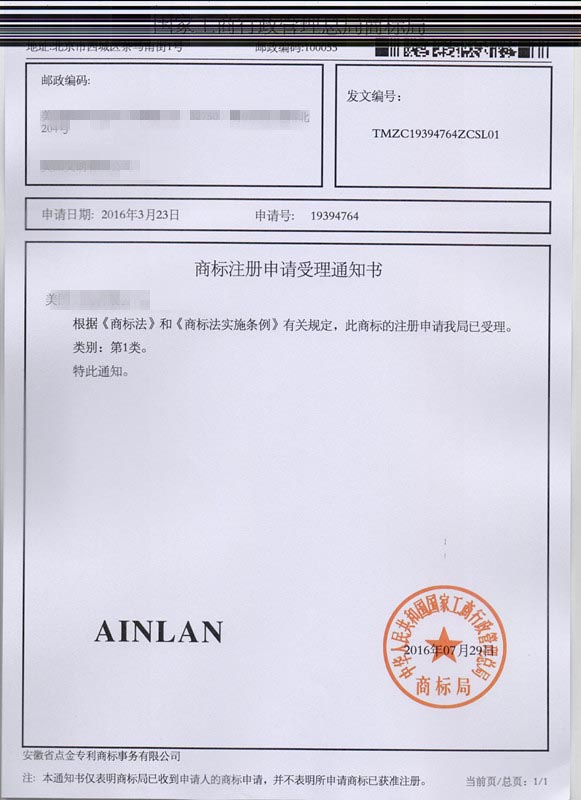 第1类“AINLAN”商标受理通知书