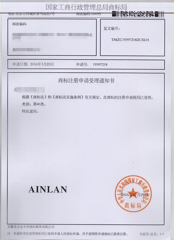 第40类“AINLAN”商标受理通知书