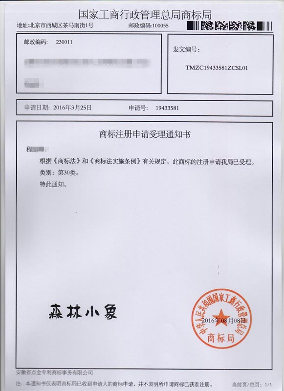 第30类“森林小象”商标受理通知书
