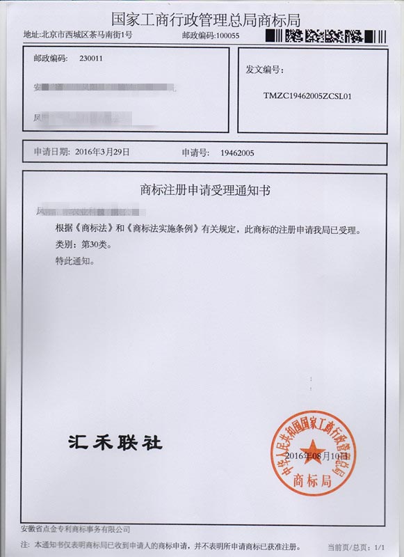 第30类“汇禾联社”商标受理通知书