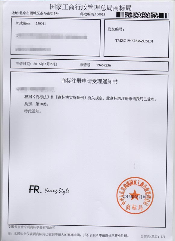 第18类“FR.YOUNG STYLE”商标受理通知书