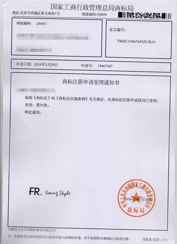 第35类“FR.YOUNG STYLE”商标受理通知书