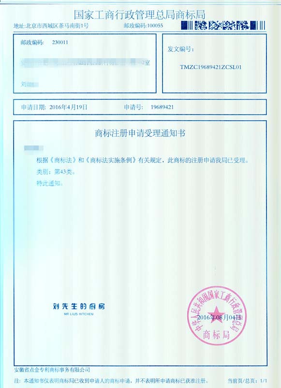第43类“刘先生的厨房”商标受理通知书