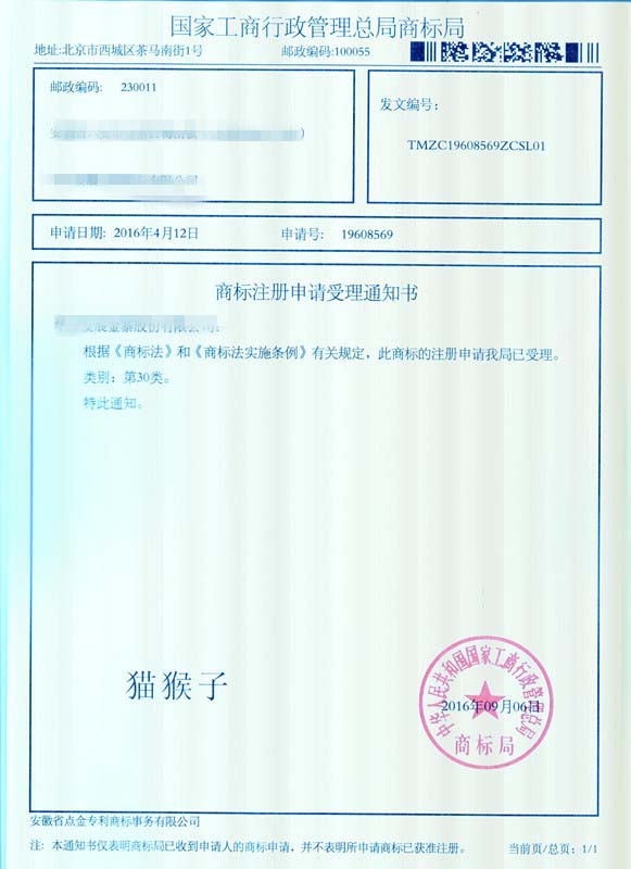 第30类“猫猴子”商标受理通知书