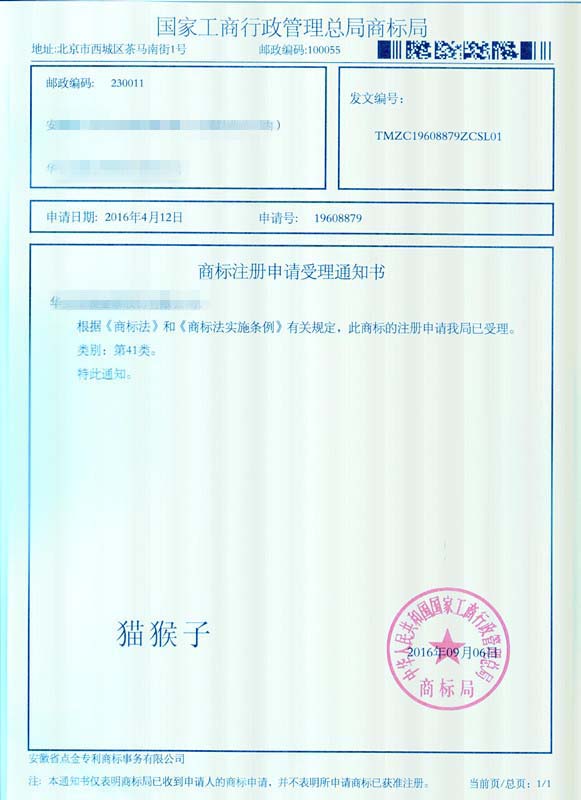 第41类“猫猴子”商标受理通知书