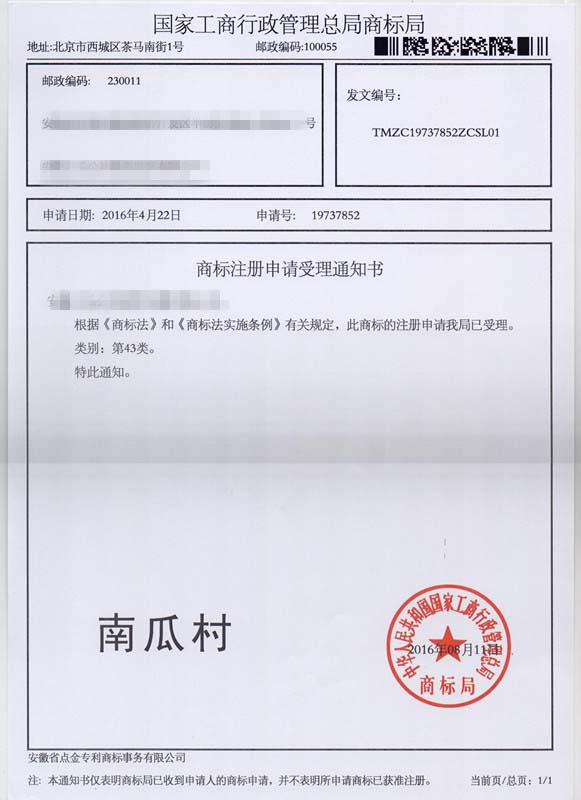 第43类“南瓜村”商标受理通知书