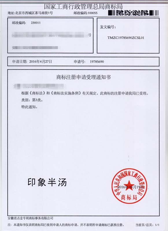第3类“印象半汤”商标受理通知书