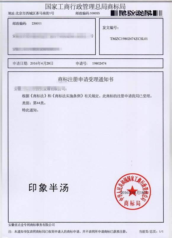 第44类“印象半汤”商标受理通知书