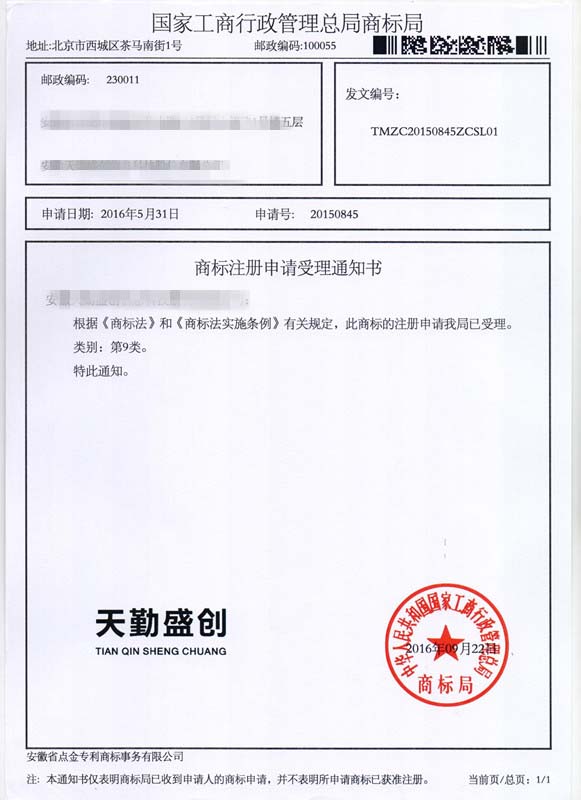 第9类“天勤盛创”商标受理通知书