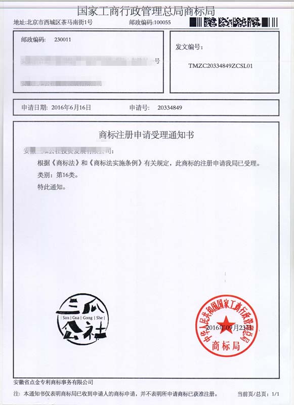 第16类“三瓜公社”商标受理通知书