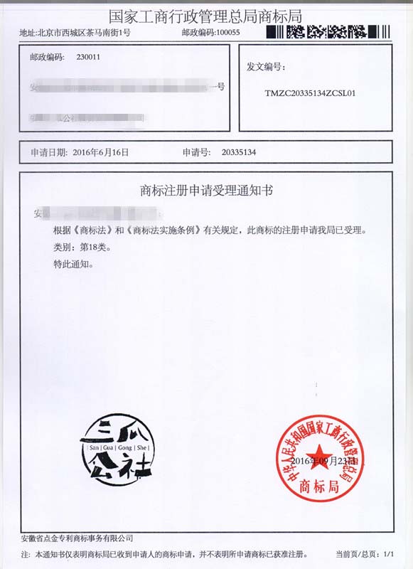 第18类“三瓜公社”商标受理通知书