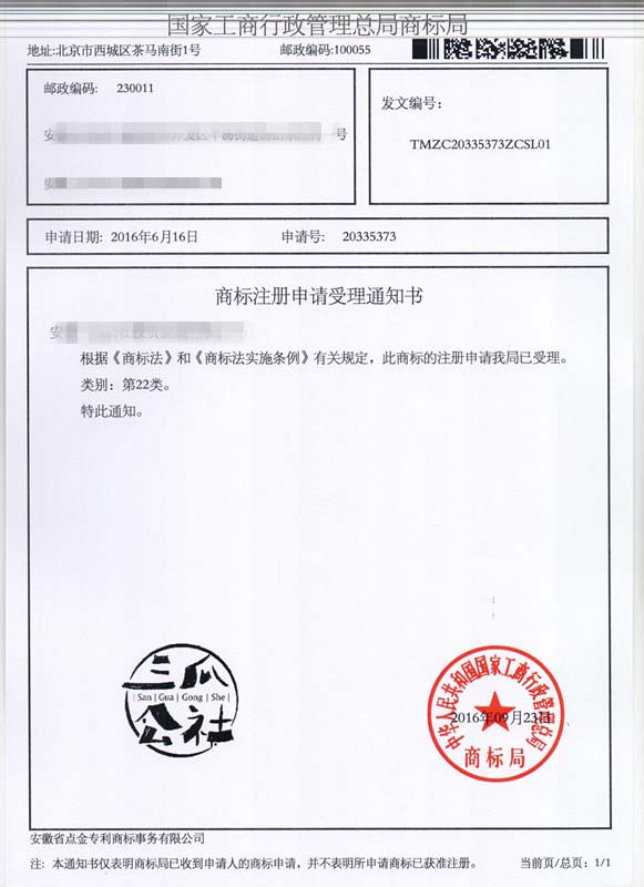 第22类“三瓜公社”商标受理通知书