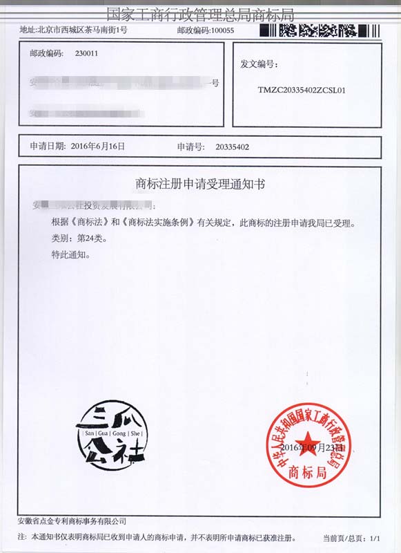 第24类“三瓜公社”商标受理通知书
