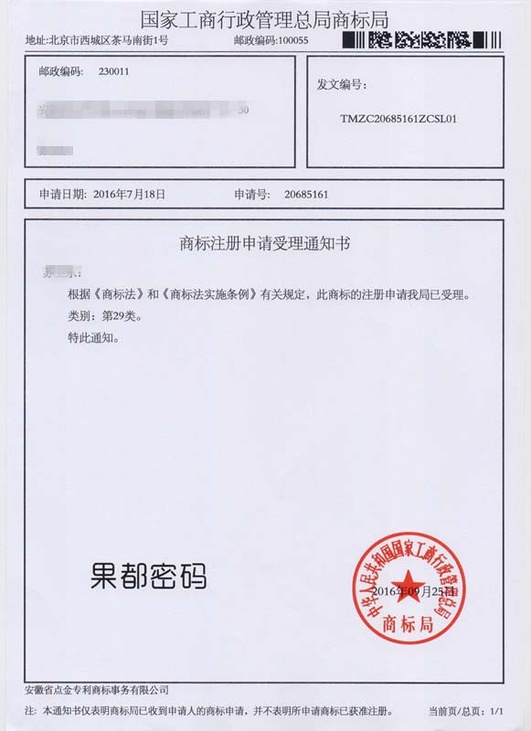 第29类“果都密码”商标受理通知书