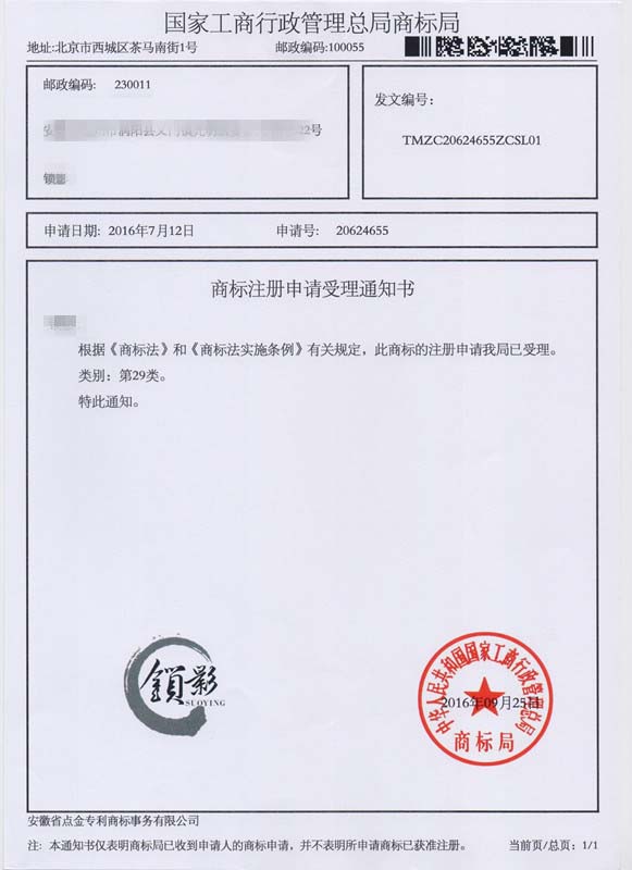 第29类“锁影”商标受理通知书
