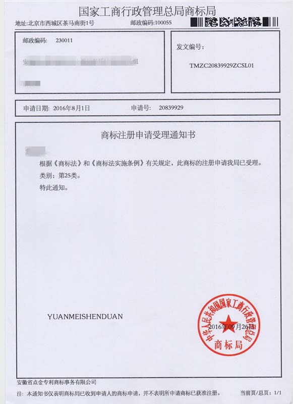 第25类“YUANMEISHENDUAN”商标受理通知书