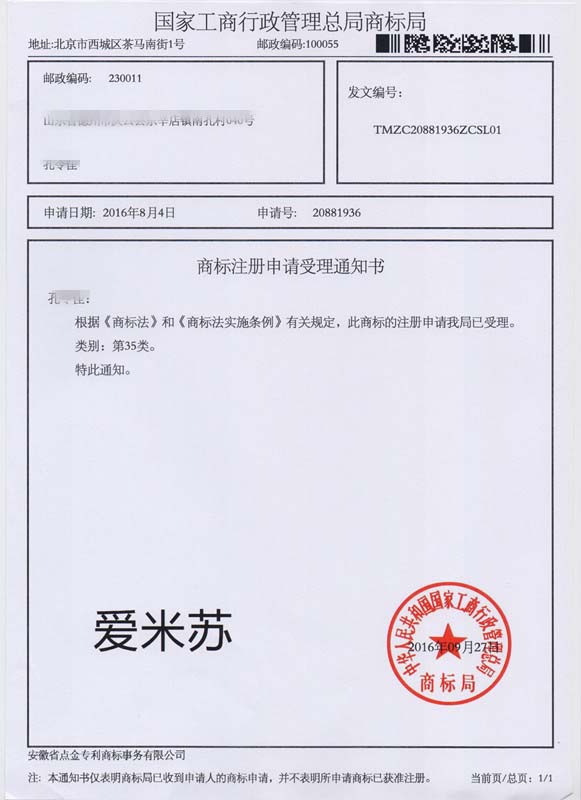 第35类“爱米苏”商标受理通知书