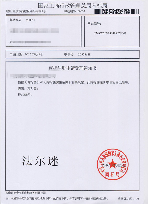 第33类“法尔迷”商标受理通知书