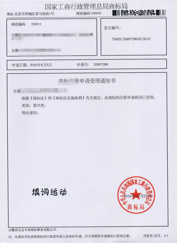 第35类“填词运动”商标受理通知书