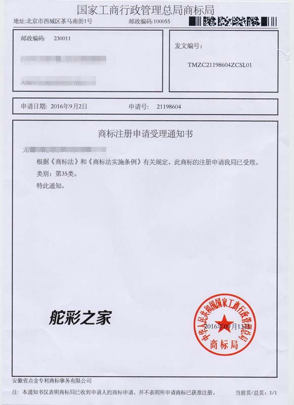 第35类“舵彩之家”商标受理通知书