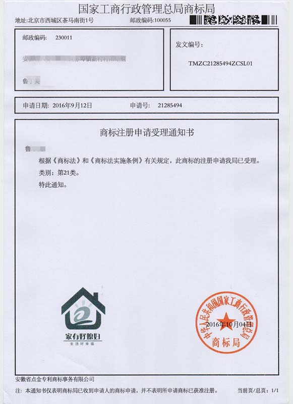 第21类“家有好媳妇”商标受理通知书