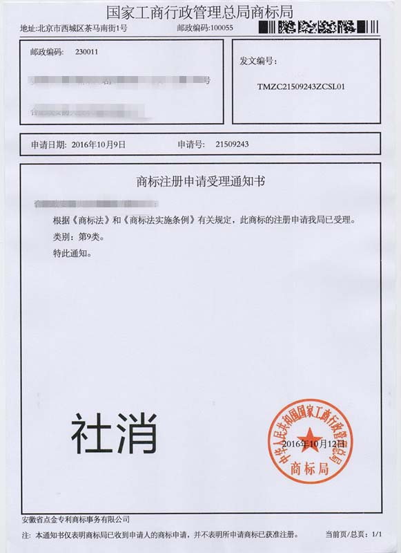 第9类“社消”商标受理通知书