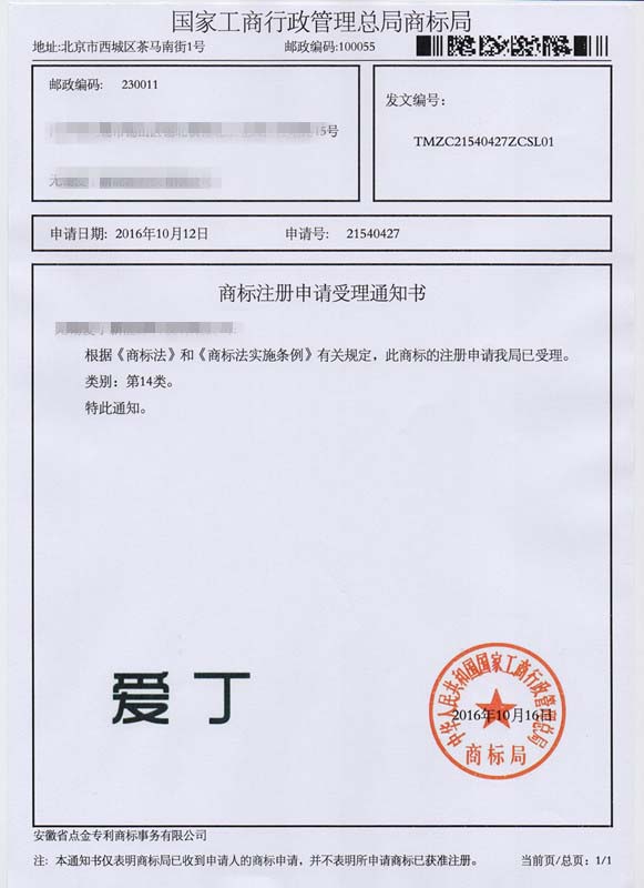 第14类“爱丁”商标受理通知书