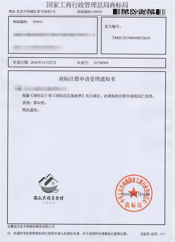第42类“西瓜民宿美食村”商标受理通知书