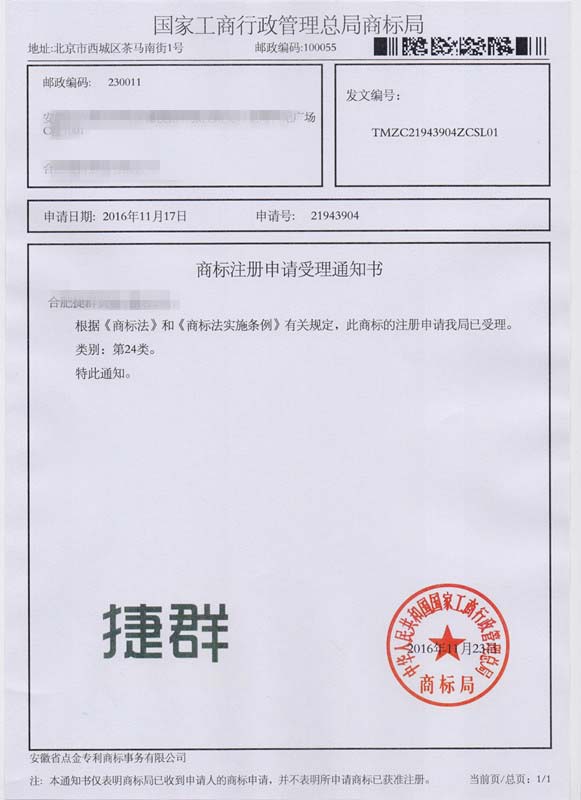 第24类“捷群”商标受理通知书