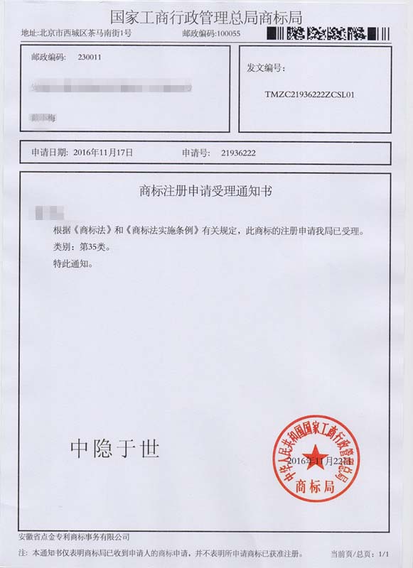 第35类“中隐于世”商标受理通知书