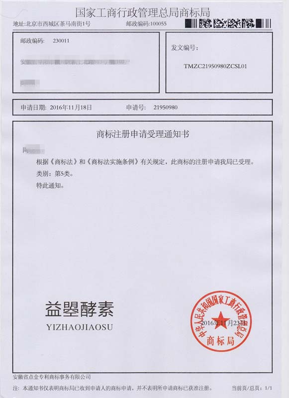 第5类“益曌酵素”商标受理通知书