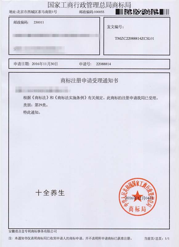 第29类“十全养生”商标受理通知书