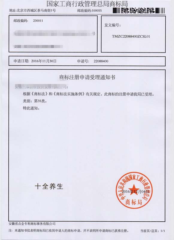 第35类“十全养生”商标受理通知书