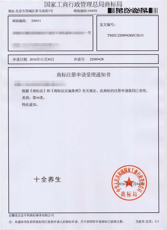第44类“十全养生”商标受理通知书
