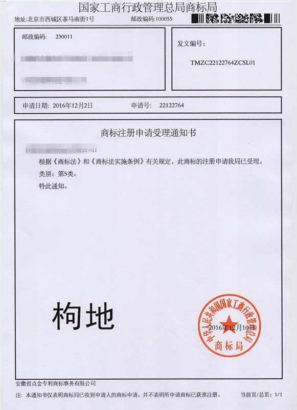 第5类“杞地”商标受理通知书