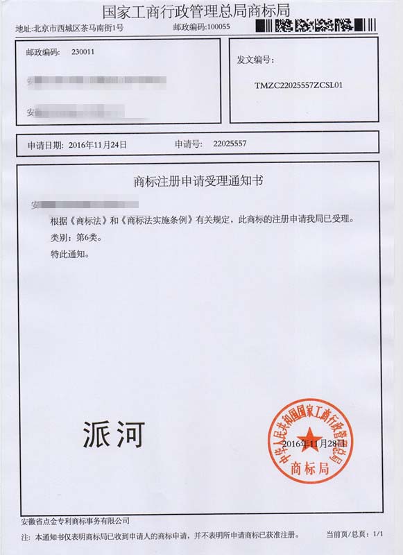第6类“派河”商标受理通知书