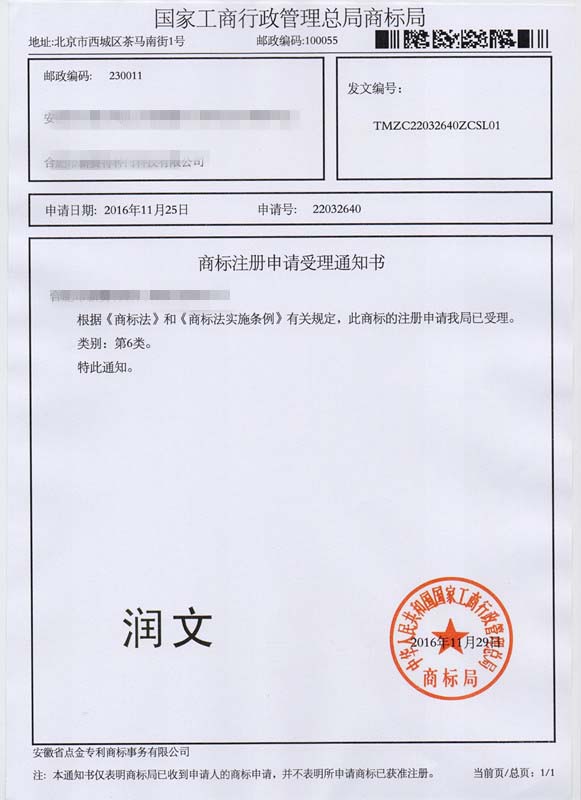 第6类“润文”商标受理通知书