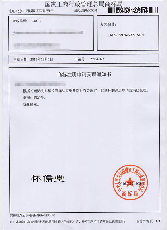 第20类“怀儒堂”商标受理通知书